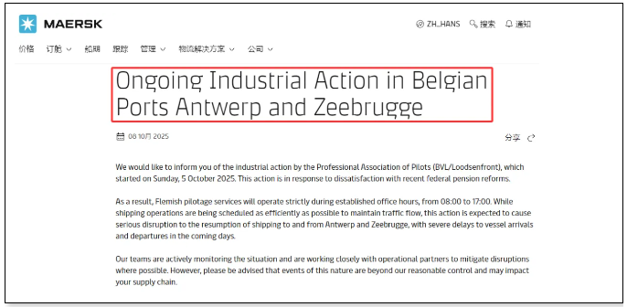 10月8日,马士基发布了比利时安特卫普港和泽布吕赫港正在进行罢工行动的预警。
